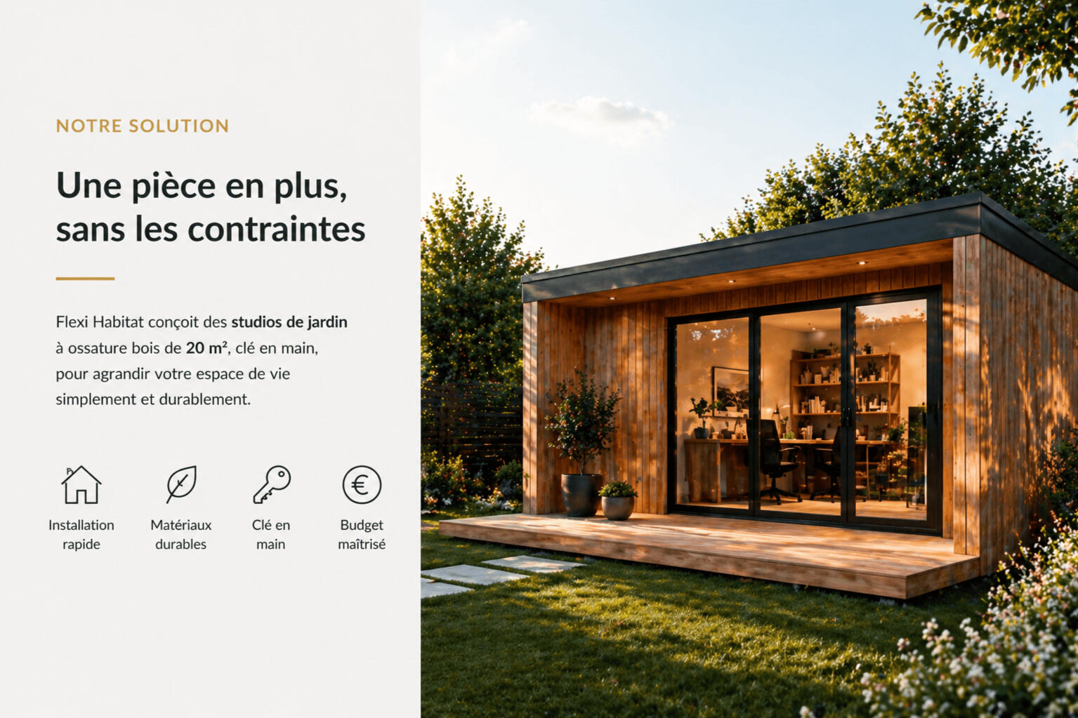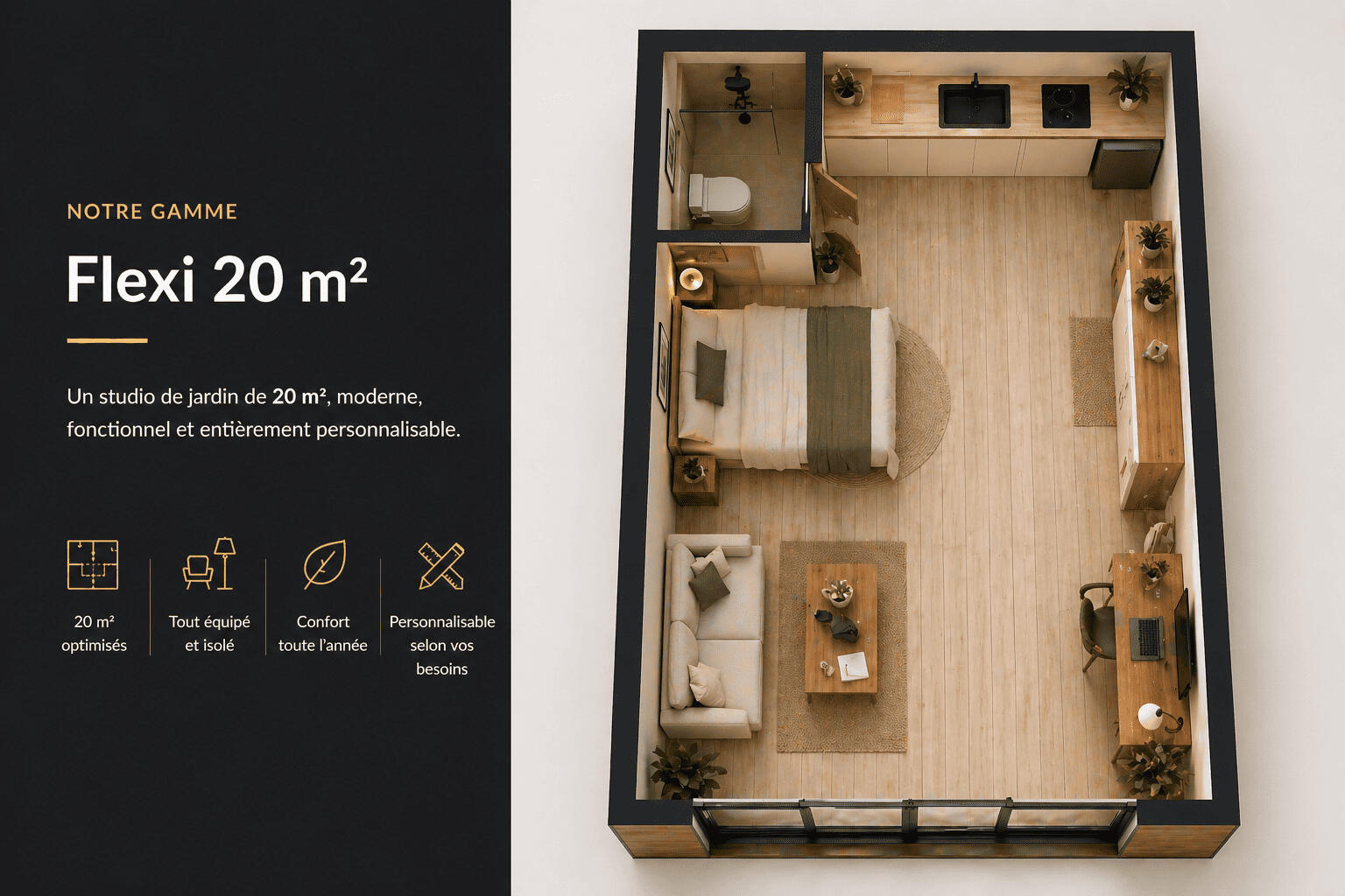 un studio de jardin à ossature bois, entièrement équipé, conçu pour créer une vraie pièce en plus dans votre jardin.Pensé pour s’intégrer facilement dans votre extérieur, ce module permet de gagner de la surface habitable sans engager de lourds travaux d’extension.Issu de notre expérience en construction de maisons individuelles, chaque projet est réalisé avec une approche garantissant qualité, cohérence et durabilité.Flexi Habitat est une marque déposé